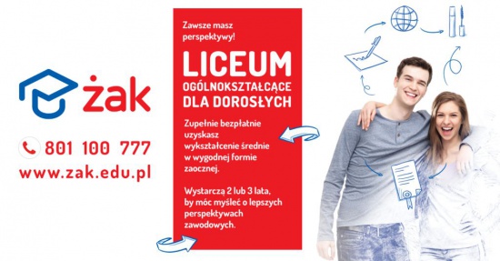 Chcesz ukończyć liceum w dwa lub trzy lata? To możliwe! Jest ŻAK – idealna szkoła dla tych, którzy potrzebują uzupełnić wykształcenie. Absolwenci gimnazjum, zasadniczej szkoły zawodowej lub ośmioletniej szkoły podstawowej mają niepowtarzalną szansę na zdobycie średniego wykształcenia. W lutym zaczynają się bezpłatne zajęcia Liceum Ogólnokształcącego dla Dorosłych ŻAK. Warto się pospieszyć, bo z początkiem września wchodzi w życie reforma przywracająca czteroletni tryb kształcenia. Wypełnij formularz online: https://raciborz.zak.edu.pl/zapisz-sie-online?city=52