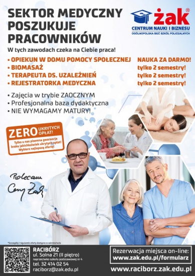 Szukasz pracy jako rejestratorka medyczna? Zapisz się do szkoły ŻAK! Zimowa rekrutacja trwa! O przyjęciu decyduje kolejność zgłoszeń! Zimno na dworze? Zapisz się do szkoły przez Internet! www.zak.edu.pl/formularz Rejestratorka medyczna w ŻAK Racibórz – specjalizacja w 2 semestry! Zaoczny system kształcenia! W programie nauczania m.in. – dokumentacja usług medycznych, rozliczanie i klasyfikacja usług medycznych, organizacja pracy rejestracji medycznej i inne. Technik administracji doskonałym uzupełnieniem rejestratorki medycznej! Zdobądź 2 zawody w tym samym czasie i wyprzedź innych kandydatów poszukujących pracy! Elektroniczna rejestracja kandydatów: www.zak.edu.pl/formularz Zapraszamy do nowej siedziby Szkoły ŻAK w Raciborzu na ul. Solnej 21 (II piętro, naprzeciw szkoły podstawowej nr 4). Tel. 32-414-02-54